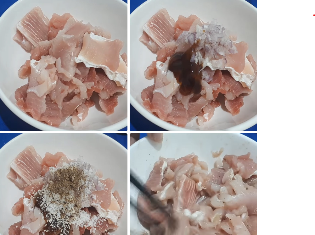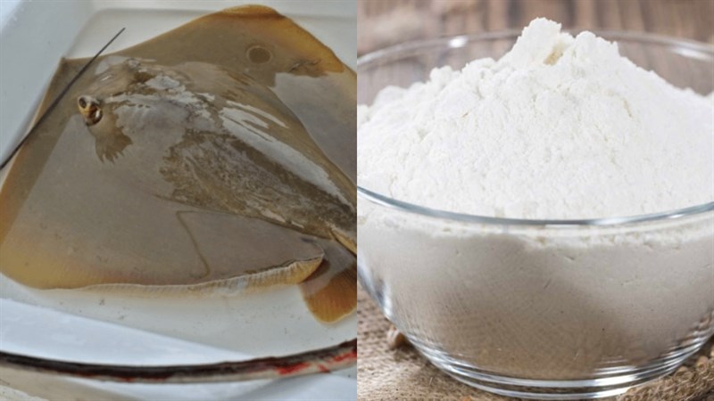 Cho cá đuối vào tô, thêm hành tím, tỏi băm nhuyễn, 1 thìa cà phê muối, 1 thìa cà phê tiêu, 1 thìa canh nước mắm, và 1 thìa cà phê đường.