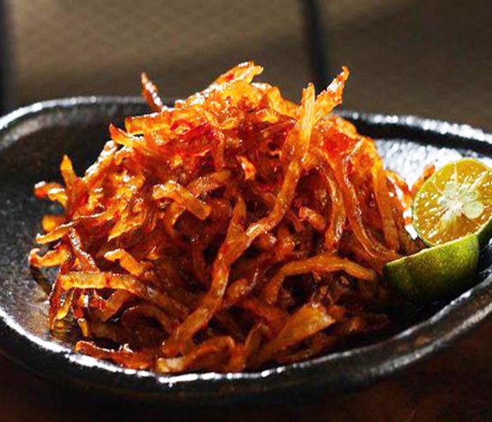 Rim khô cá bò với sa tế, nước mắm và đường.
